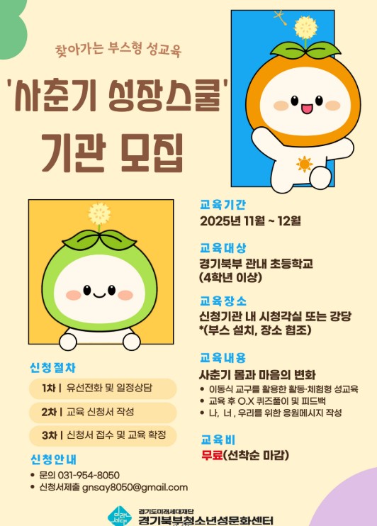 경기도에 따르면 2025년 10월 경기도미래세대재단에서 운영하는 경기북부청소년성문화센터가 초등학교 학년 아동·청소년 대상 찾아가는 부스형 성교육 사춘기 성장스쿨’ 프로그램에 참여할 교육기관 9곳을 선착순 모집한다고 한다.